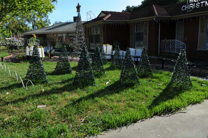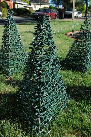 The train tracks in past years have been formed by LED 240v rope light. With the move away from 240V lights being used on the ground in the yard this year, and the lights from the mini-trees being replaced with LED, it was fitting that the old fairy lights continue to live in a new form. This year they were wound onto 19mm PVC pipe and supported on T-bar mounts to simulate railway tracks.